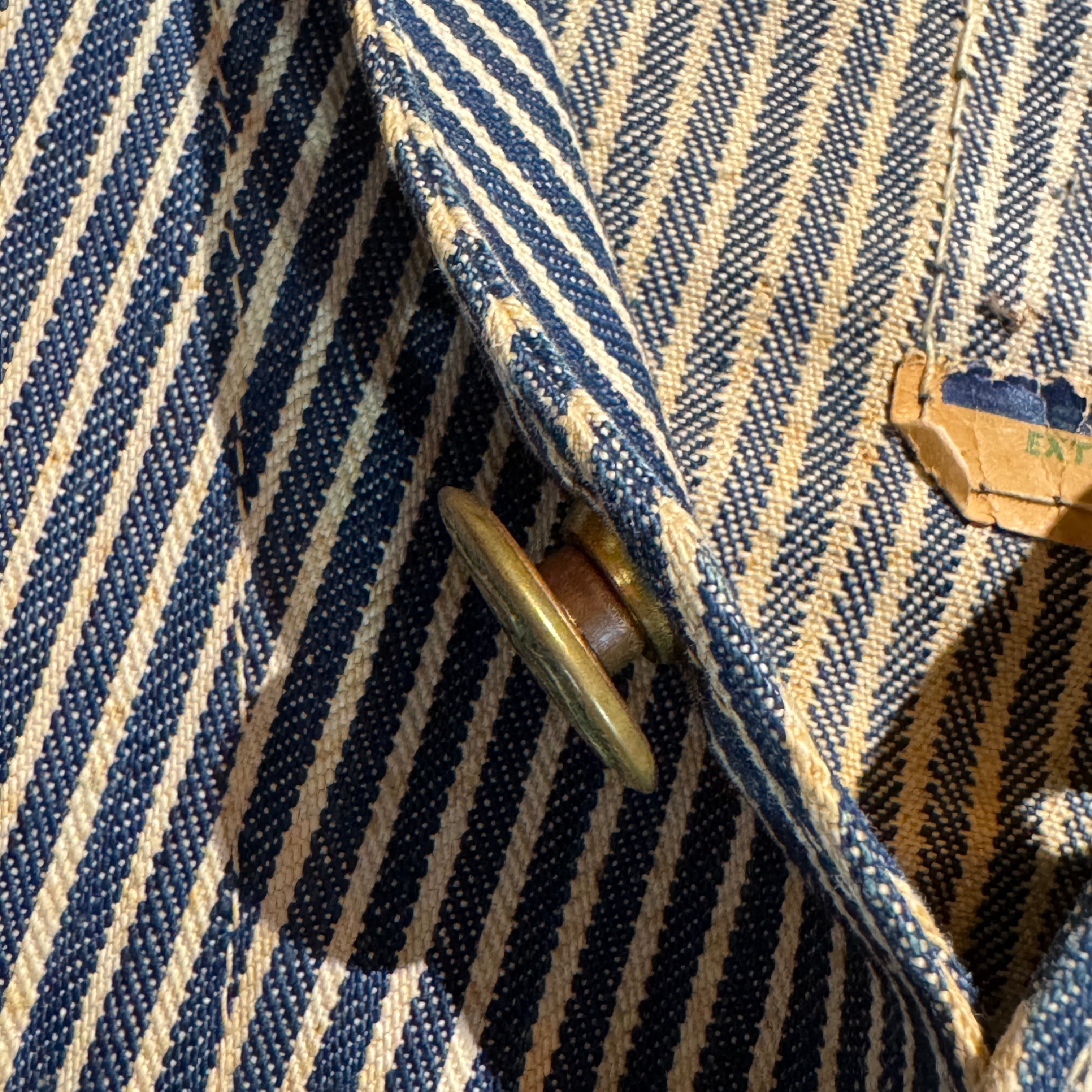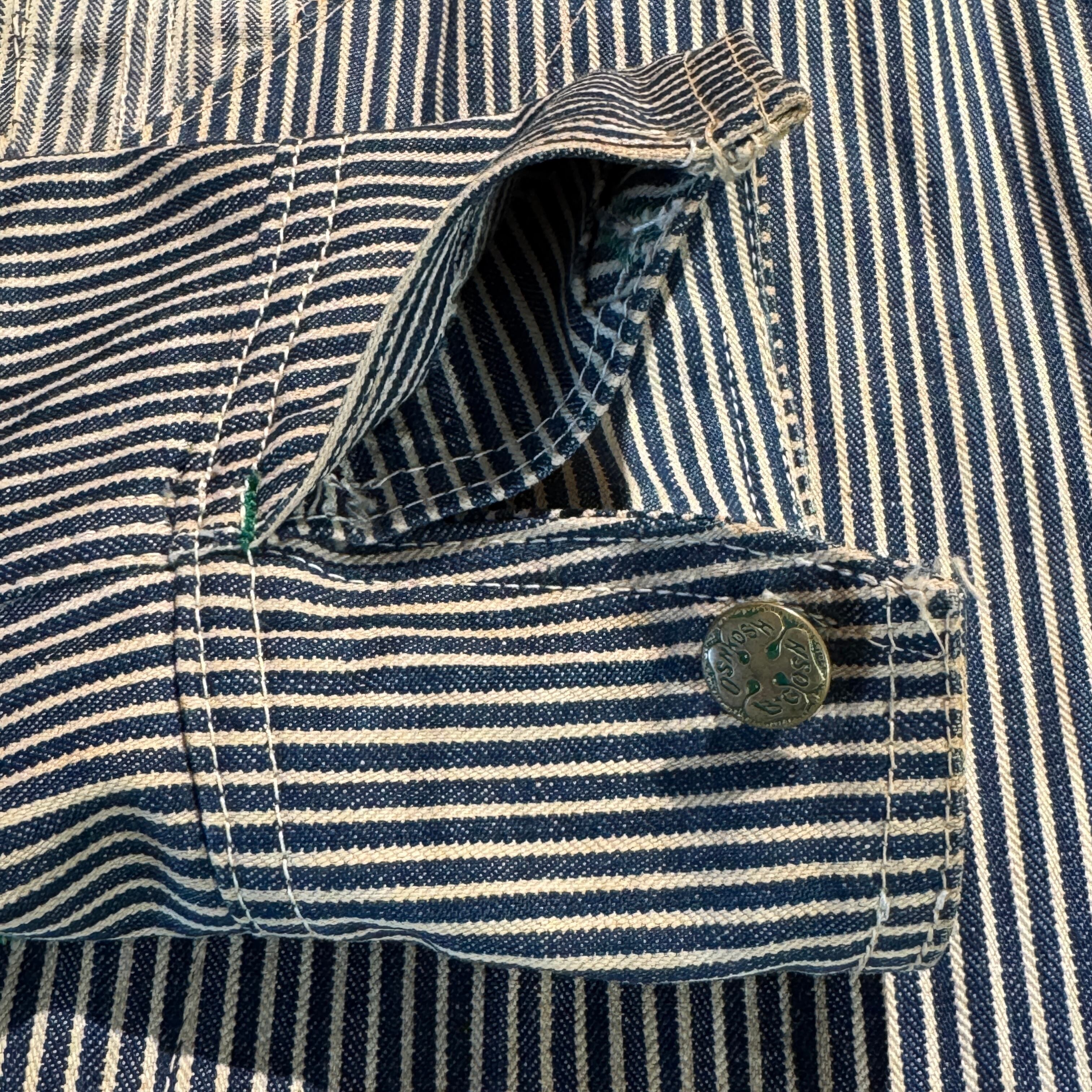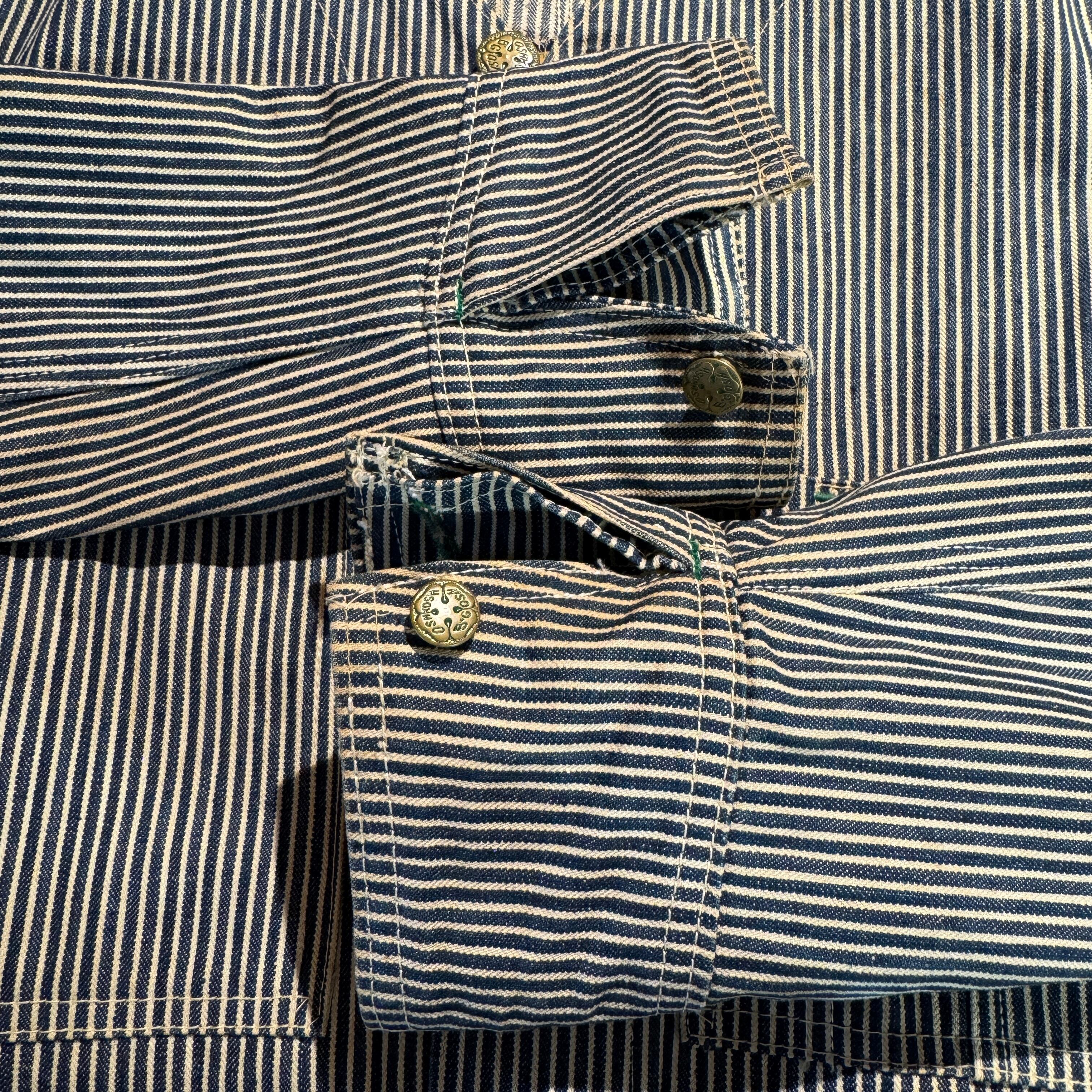 40〜50年代のOshKosh B'Gosh製エンジニアジャケット。ヒッコリーストライプ柄に、首振り20mmのデカボタン、カフスのボタン隠し仕様など、当時特有のディテールが光ります。紙タグも残る希少な個体。ヴィンテージワークウェアを代表する逸品で、アメカジコーデにも抜群の存在感。