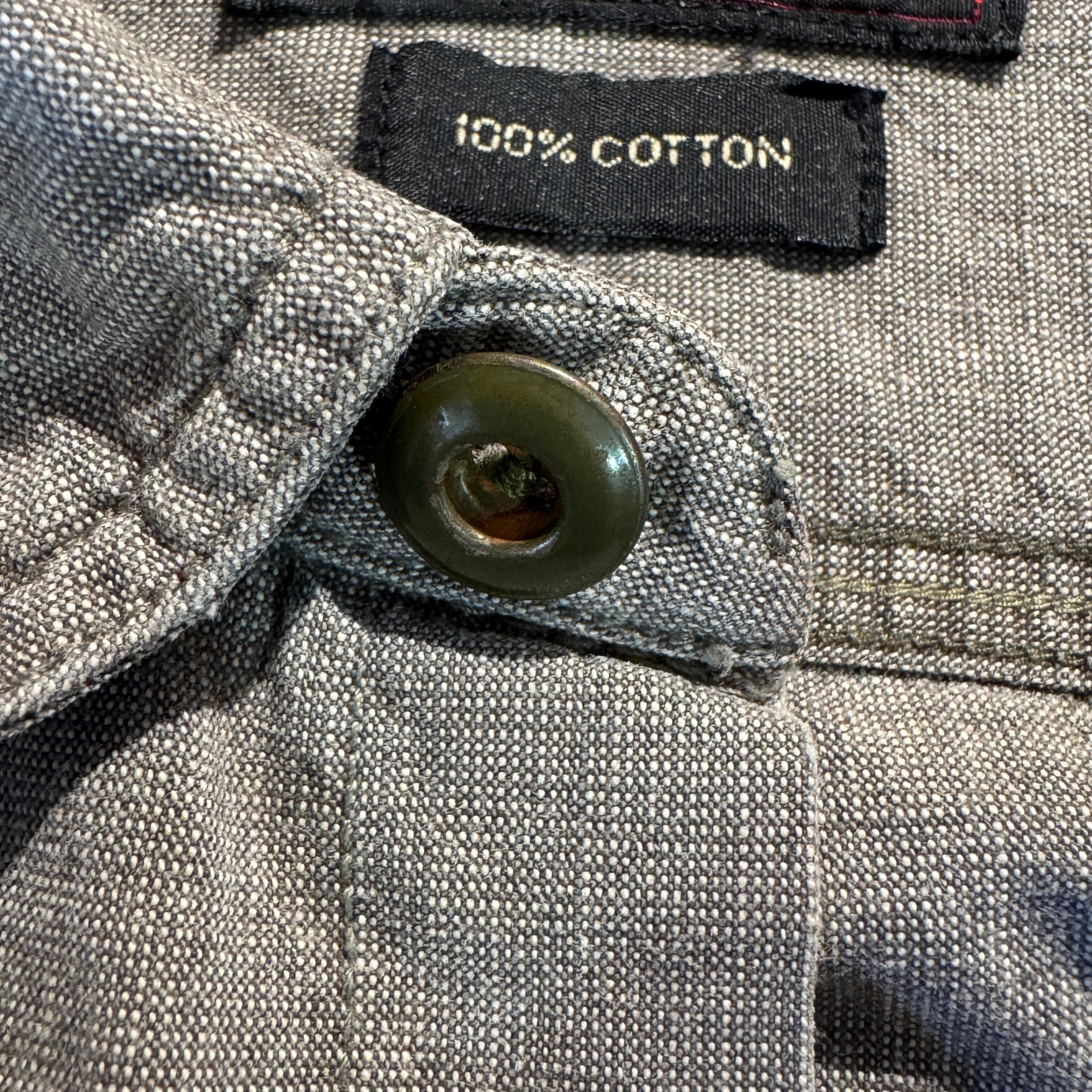 珍しいグレーカラーに、ガチャポケ、メタルボタン、マチ付きのディテール。