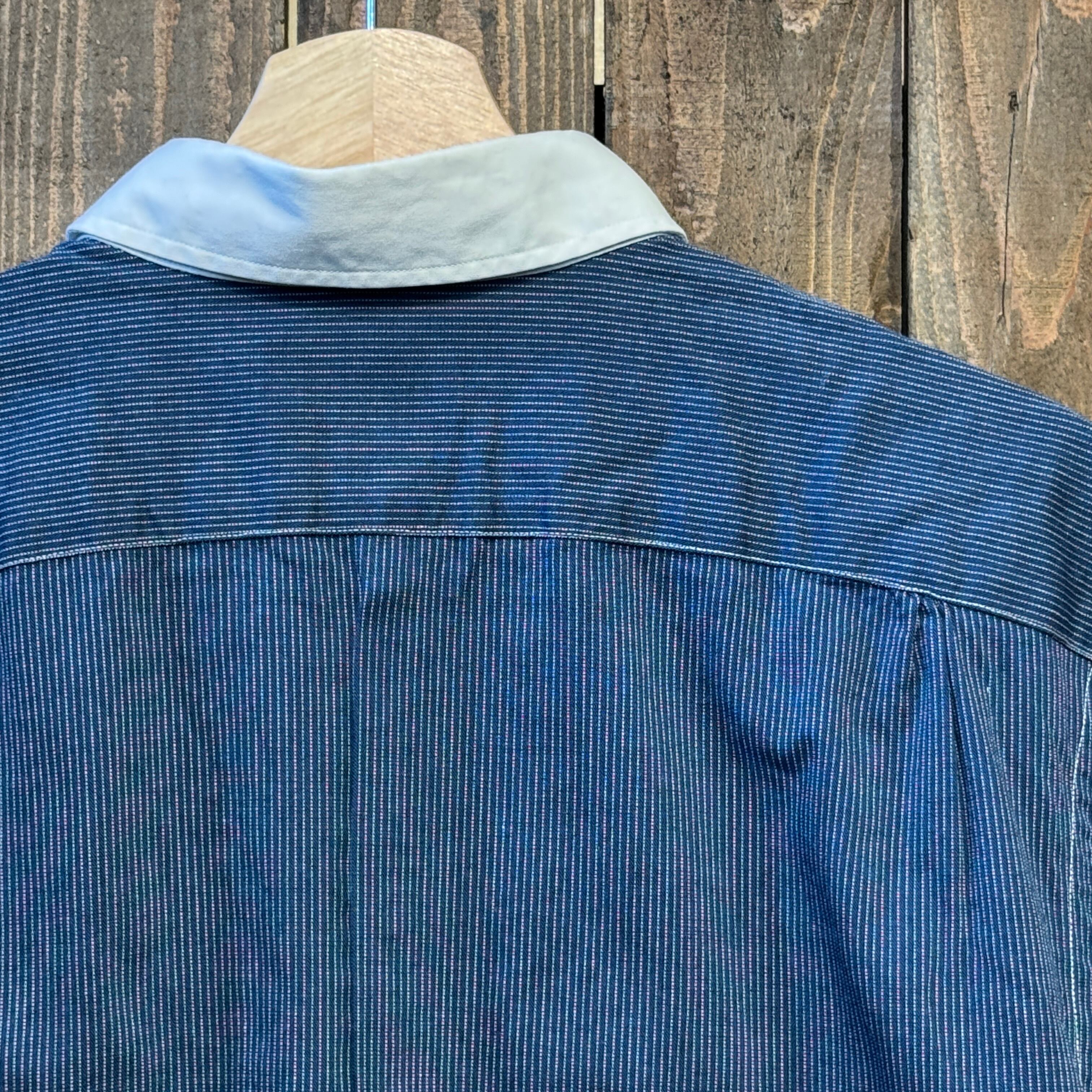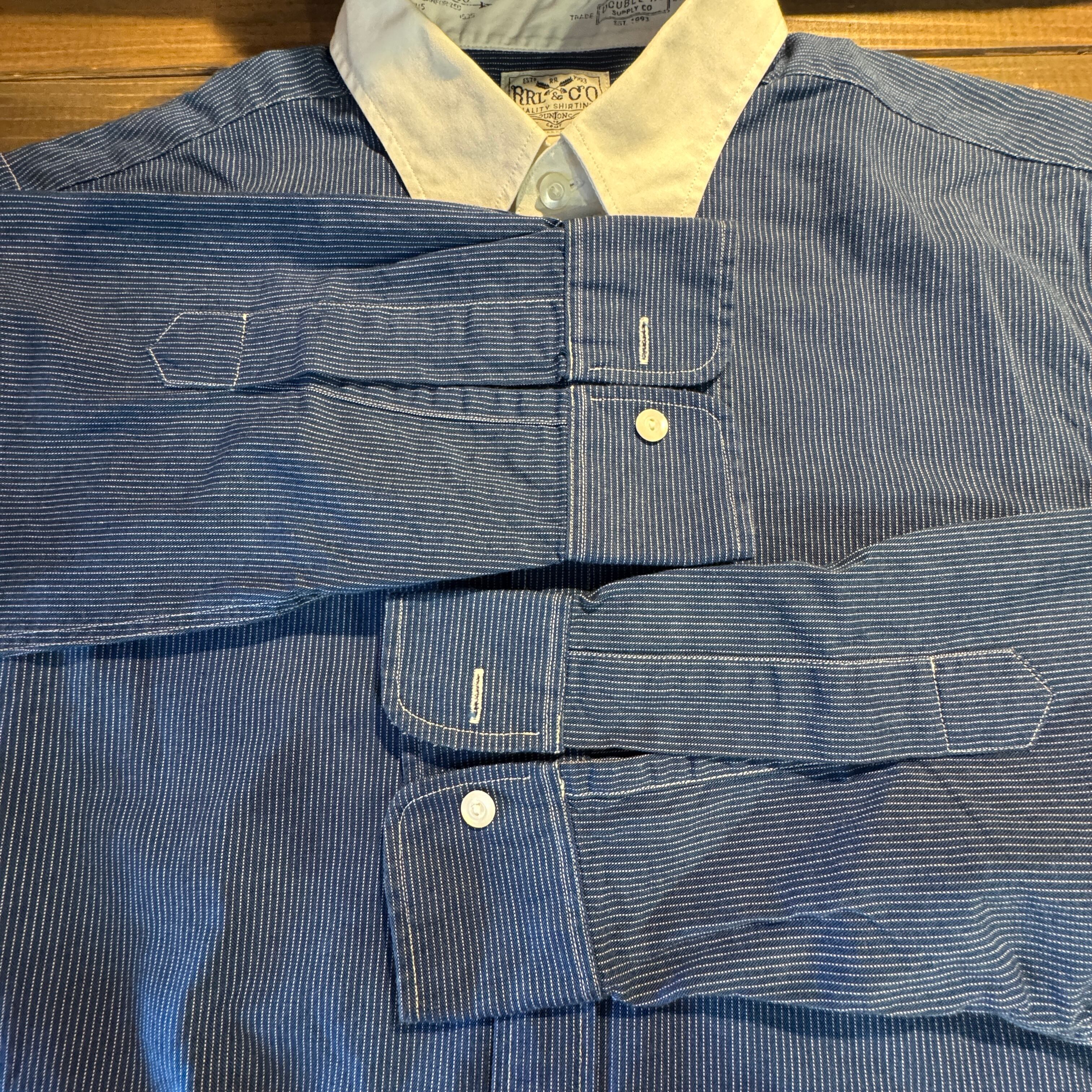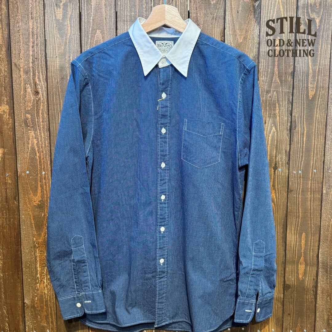RRLらしいドットストライプ柄の長袖シャツ。ホワイト×ツートーンの襟やVステッチ入りワンポケット、マチ付き仕様など、クラシックなディテールが魅力。まるでウォバッシュシャツのような雰囲気もあり、ワークとドレスの融合を楽しめる逸品。Lサイズでゆったり着られ、コンディションも良好です。